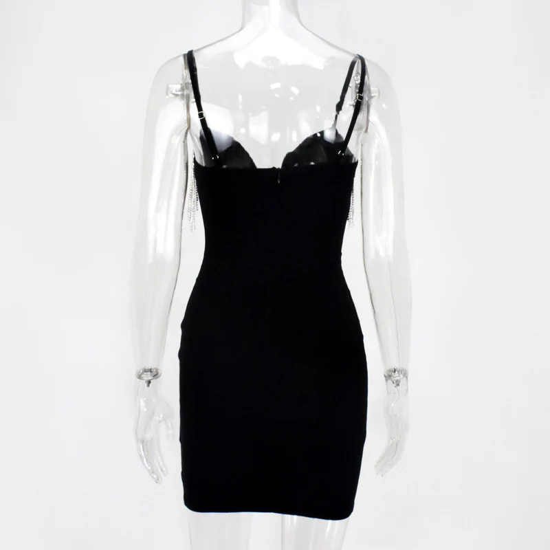 Abito con profondo scollo a V, con frange di strass lunghe. Modello a tubino stretto elasticizzato con spalline sottili, chiusura zip posteriore.In diversi colori.